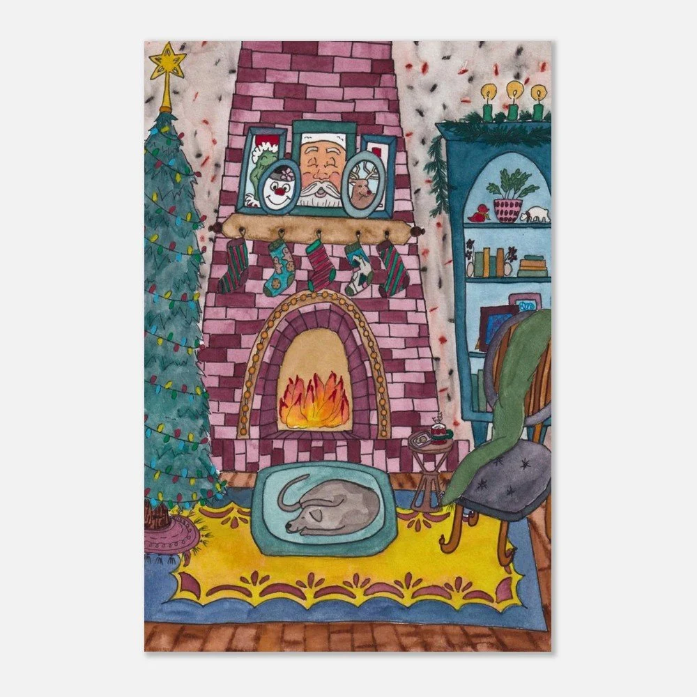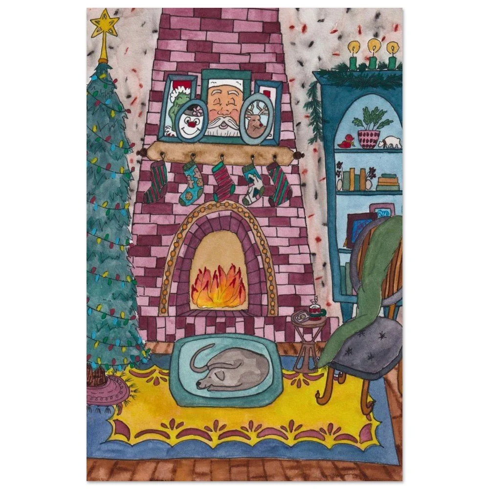 This Cozy Christmas art print was inspired by a vision of a cozy home dressed up for Christmas! I love an old home with character which makes me think of deep wood floors, a built up fireplace, interesting furniture and playful accents. I loved the idea of illustrating this but in a Christmas setting. All the stockings hung over the fireplace with a mantle layered with iconic holiday members. While this print is meant to bring all the cozy and joy of Christmas to your walls and shelves there are a lot of little details for the eye to catch and the heart to enjoy!